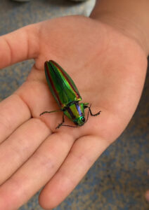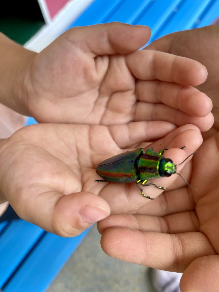 園庭で、背中に縞模様があり、🟢緑色でピカピカ✨に光る「虫」を見つけました。