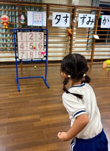 紙で作った魚を磁石の釣り竿で釣る「魚つり」、狙いを定める「的当て」、そして大盛り上がりの「ボーリング」など、それぞれの遊びに夢中になりました。