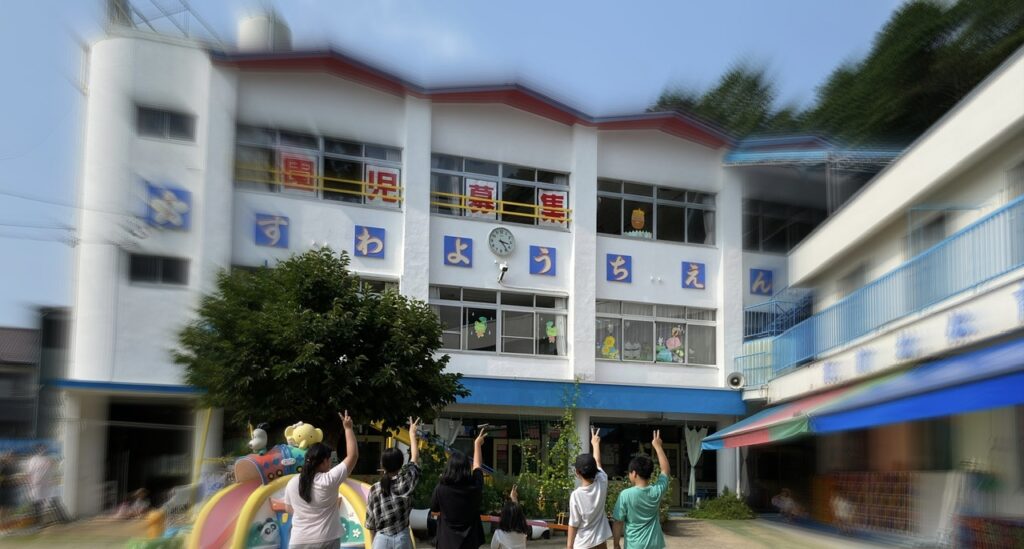 来園の記念に写真を撮っていると、偶然その場にいらっしゃった卒園生で園児のお母様も加わり、にぎやかに2回目の記念撮影となりました。