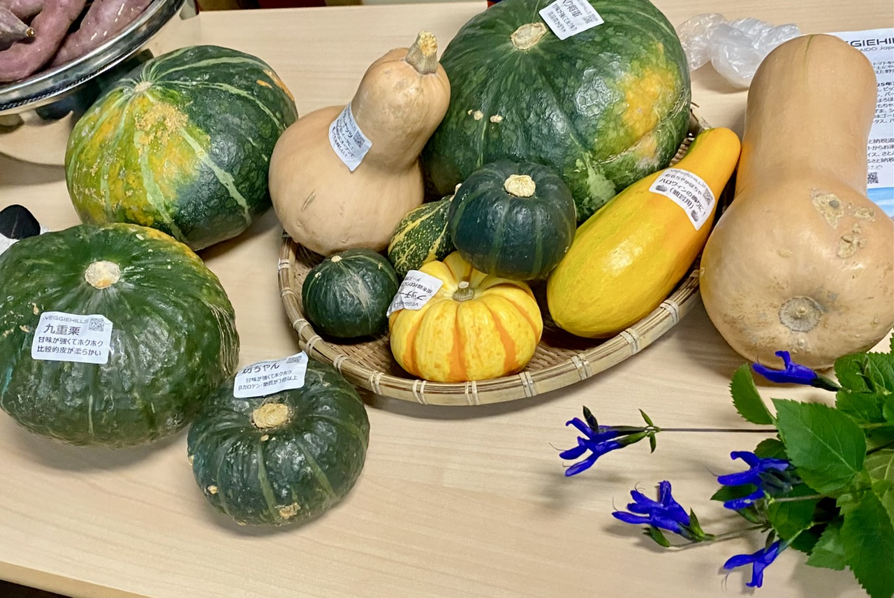 事前に、北海道の有機農家「ベジヒルズ」さんから届いていたカボチャたちを、