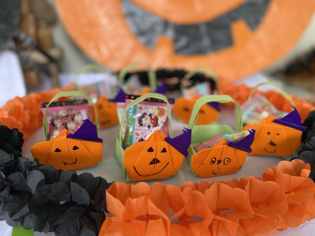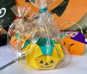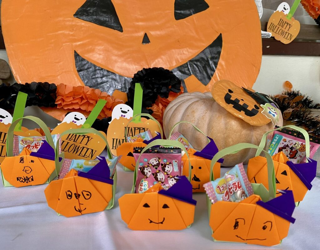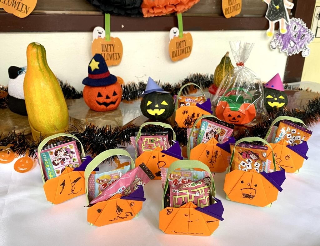 園児が折り紙で作ったカボチャの入れ物に、