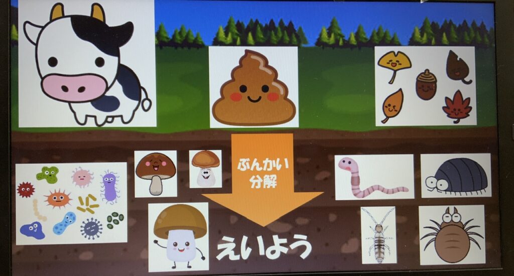 「牛のウンチ、枯れ葉、ダンゴムシ、きのこ、微生物…全部が土のごはんになるんだよ」と聞くと、