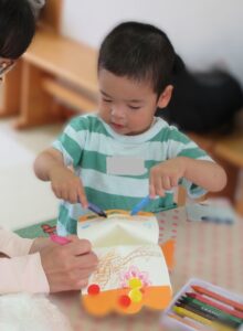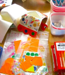お子さまはペンで、自由に絵を描いたりシールを貼ったりして模様づけ。