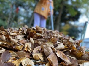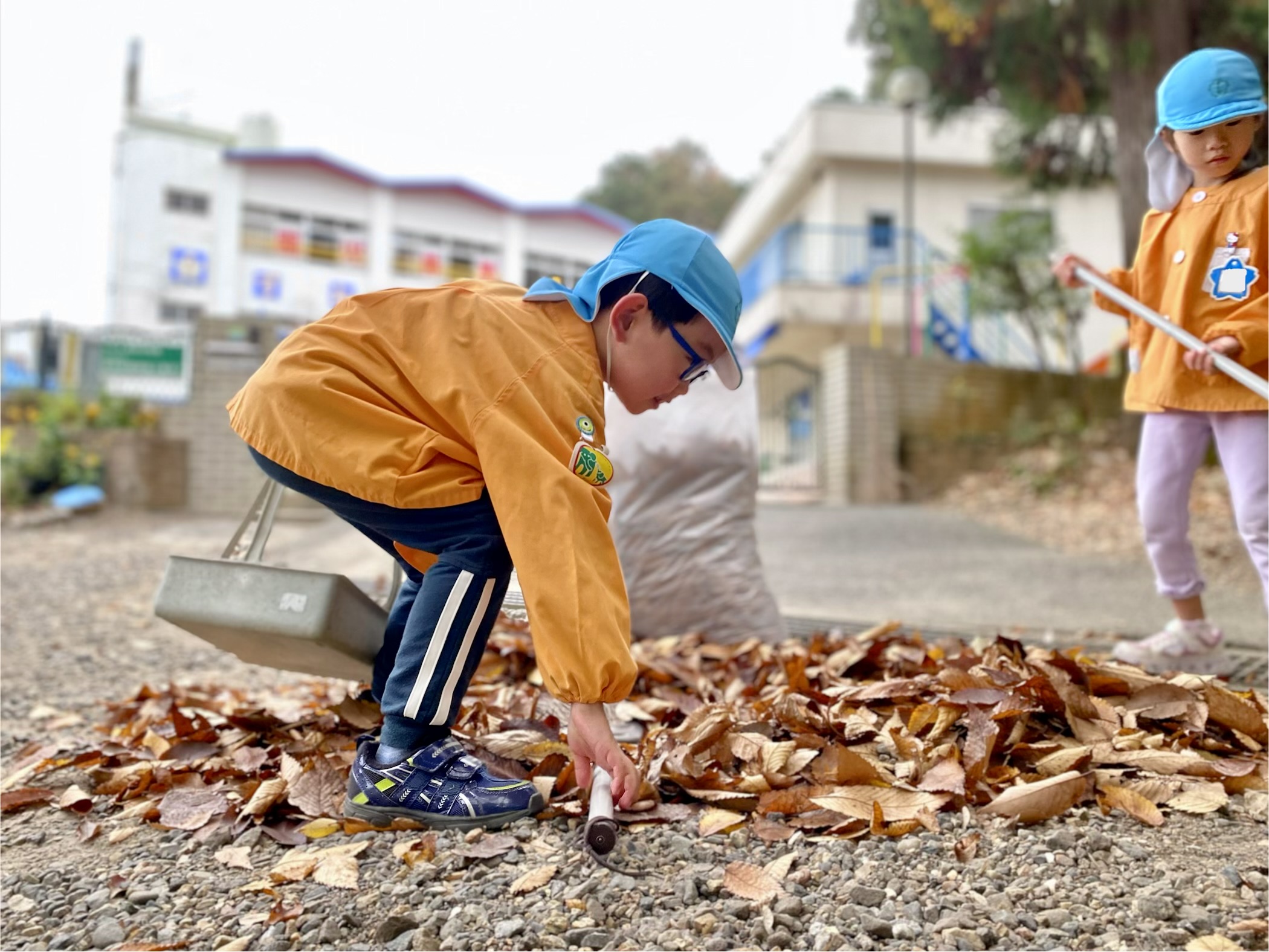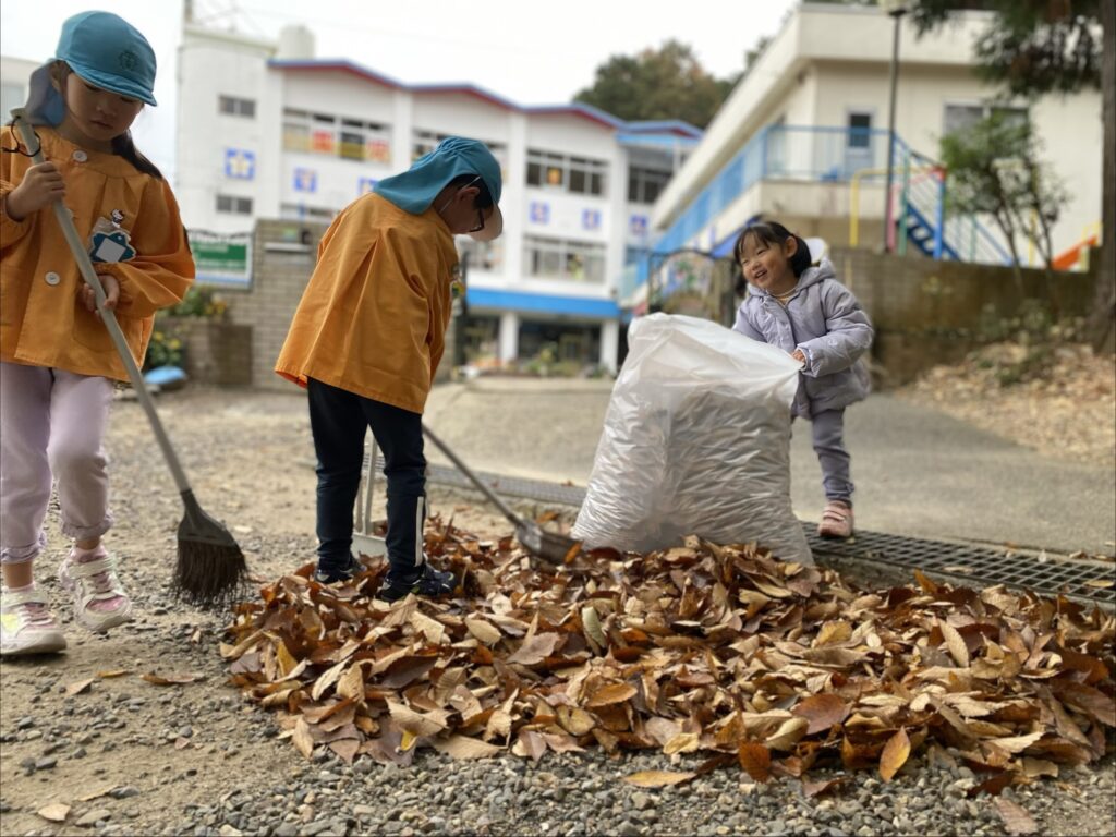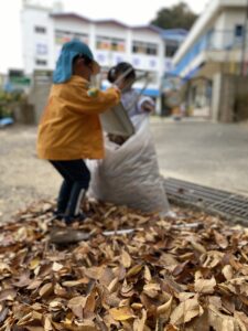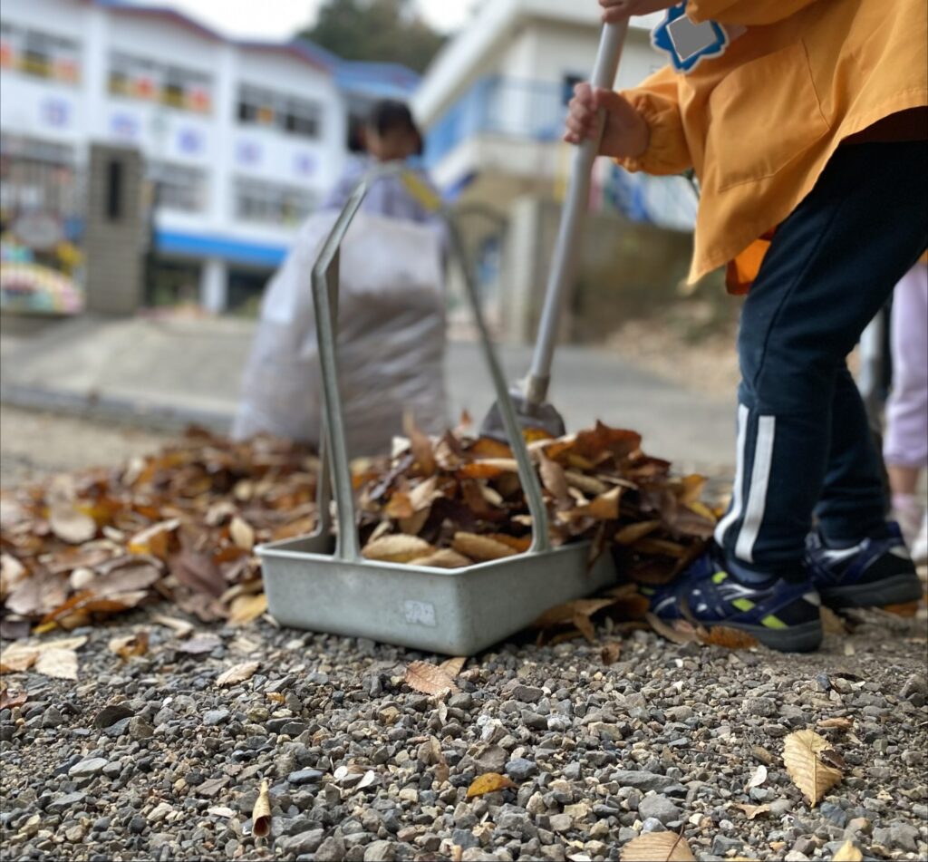 朝、保育者が落ち葉を掃いていると、